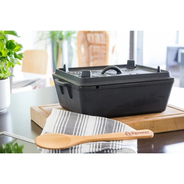 Die Petromax Kastenform k8 ist perfekt für Brot, Kuchen, Auflauf und ähnliches geeignet. Der Deckel der gusseisernen Formen lässt sich beim Draußen-Kochen mit Glut oder Briketts bestücken, so dass eine hervorragende Rundumwärme entsteht, wie bei einem Feuertopf. Außerdem kann der Deckel mit Füßen und Rillenprofil umgedreht perfekt als Steak- und Grillpfanne draußen verwendet werden. Im Backofen funktioniert die Guss-Kastenform als Bräter oder für leckeren Nachtisch.Art.-Nr.: 1532787
