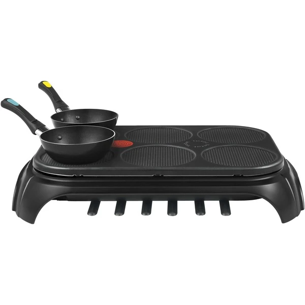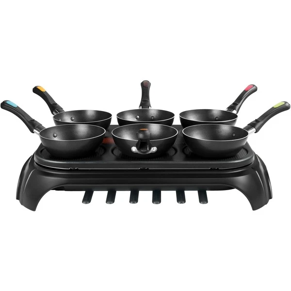 Das Tefal Mini Wok Set Wokparty Duo PY5828 bietet die Möglichkeit, gemütlich mit der Familie oder den Freunden am Tisch asiatische Speisen zuzubereiten. Mit 6 Wokpfannen kann sich jeder seine Lieblingszutaten zusammenmischen und leckere Gerichte kreieren. Die Grillplatte ist außerdem auch ohne die Pfannen verwendbar, z.B. für Crêpes oder Omlette. Die kleinen Wokpfännchen sind am Griff farbig markiert, wie man es auch vom Fondue oder Raclette kennt, damit es keine Verwechslung gibt und jeder zur richtigen Wokpfanne greift. Außerdem sind sechs farbige Plastikspatel für die Woks und sechs schwarze Plastikspatel für die Zubereitung von Crepes enthalten, sodass sich jeder nach der Hauptmahlzeit noch sein eigenes Dessert zubereiten kann. Ein Thermo Spot am Gerät zeigt an, wenn die richtige Temperatur erreicht ist, um mit der Zubereitung zu beginnen. Die Leistung von 1.000 Watt bringt den Wokparty Duo PY5828 schnell auf Betriebstemperatur. Die Wokpfännchen und die Heizplatte sind antihaftbeschichtet, das erleichtert die Zubereitung und die Reinigung nach der Party erheblich. Ein Rezeptbuch für die Inspiration vor dem Einkauf für den Party- oder Familienabend ist im Lieferumfang enthalten.Art.-Nr.: 1859460